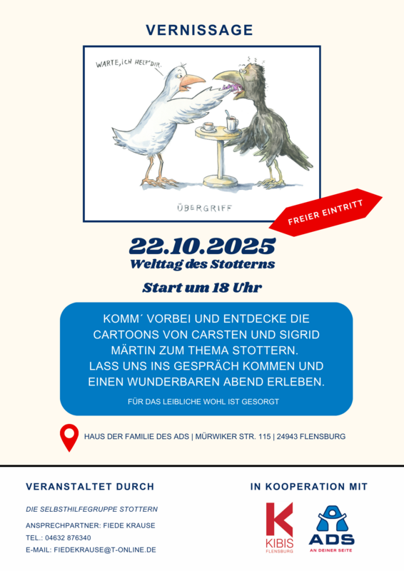Am Mittwoch noch nichts vor? Dann komm ins Haus der Familie des ADS und sei bei der Vernissage von wundervollen Werken zum Thema Stottern dabei!